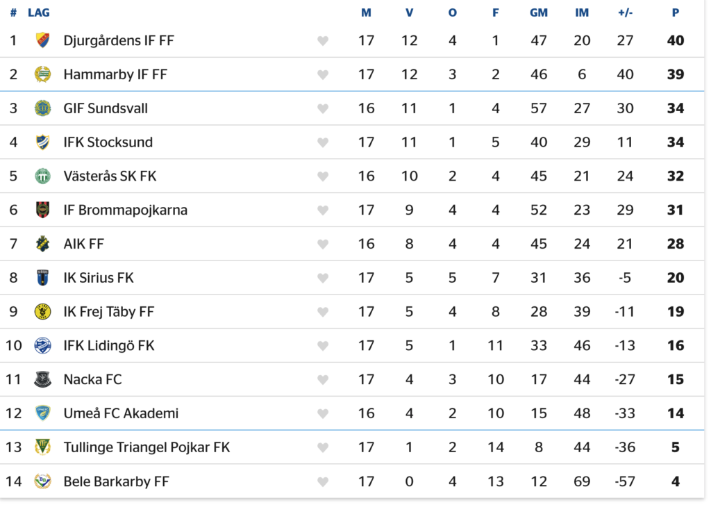 Hammarby är tvåa, mycket tack vare en prickfri defensiv: sex insläppta på 17 omgångar imponerar stort. Flest gjorda mål har tabelltrean GIF Sundsvall gjort: 57 totalt, varav tolv har kommit i de senaste två matcherna mot Sirius och Frej.