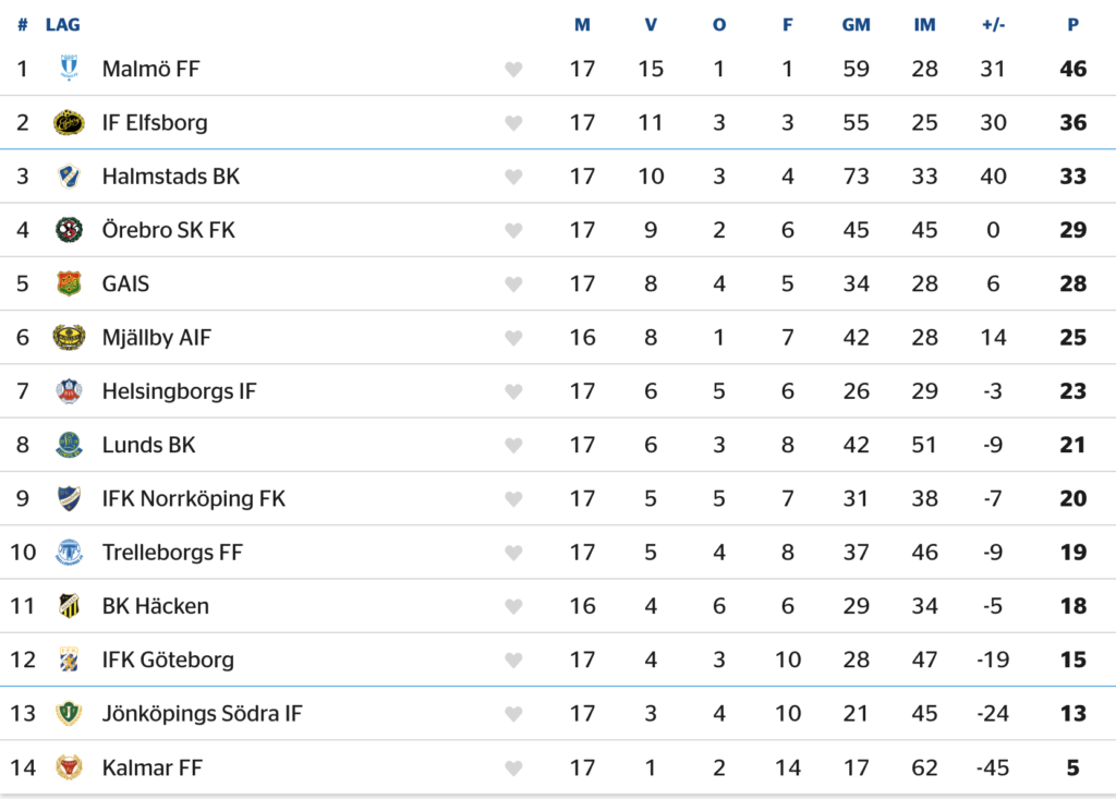 Elfsborg skuggar på andraplatsen, och kan stoltsera med att ha släppt in minst mål i serien. Man jagas samtidigt av ett Halmstads BK som gjort flest – 73 totalt, och ett snitt på över fyra fullträffar per match.