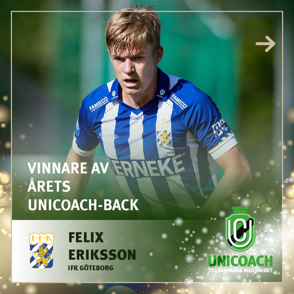 Årets Unicoachback är IFK Göteborgs Felix Eriksson. Felix varvade spel i P18-landslaget med att göra 18 matcher och två mål för IFK Göteborg i årets P19 Allsvenskan. Utöver det har Felix också fått debutera i Allsvenskan under året.