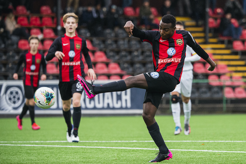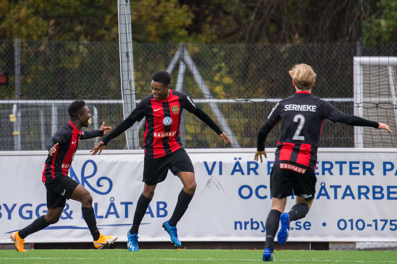 Foto: Jonathan Näckstrand / BILDBYRÅN / COP 94 / JN0004201024 Brommapojkarnas Exaucé Munganga jublar efter sitt 1-0 mål under fotbollsmatchen i U16 SM-finalen mellan Brommapojkarna och Häcken den 24 oktober 2020 i Stockholm.