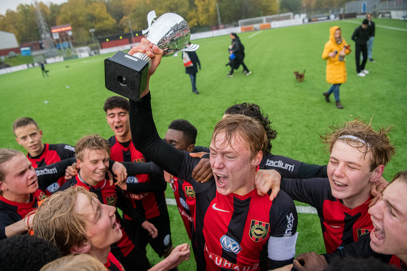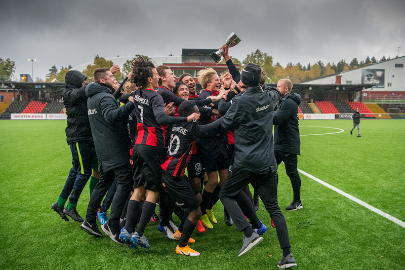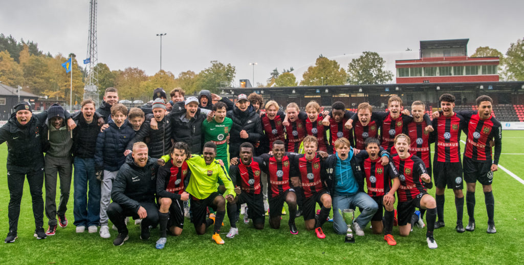 Foto: Jonathan Näckstrand / BILDBYRÅN / COP 94 / JN0004201024 Brommapojkarnas spelare jublar med pokalen efter fotbollsmatchen i U16 SM-finalen mellan Brommapojkarna och Häcken den 24 oktober 2020 i Stockholm.