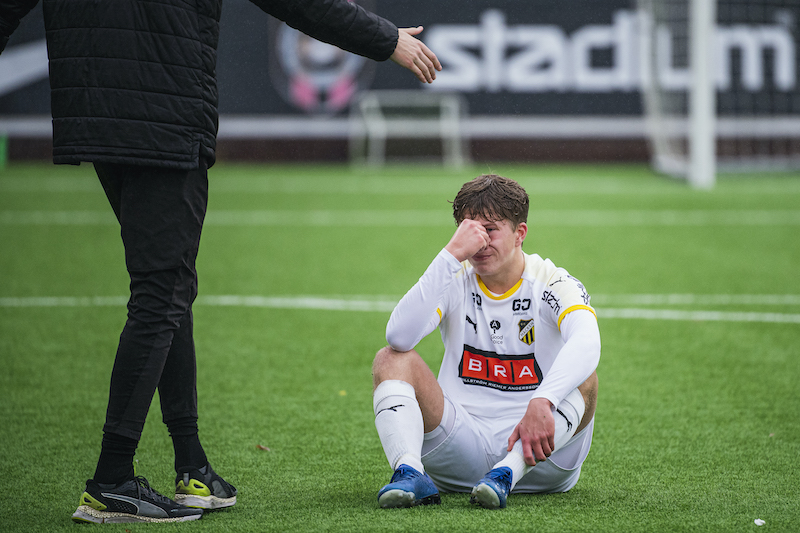 Foto: Jonathan Näckstrand / BILDBYRÅN / COP 94 / JN0004201024 Häckens Felix Wessbro deppar efter fotbollsmatchen i U16 SM-finalen mellan Brommapojkarna och Häcken den 24 oktober 2020 i Stockholm.