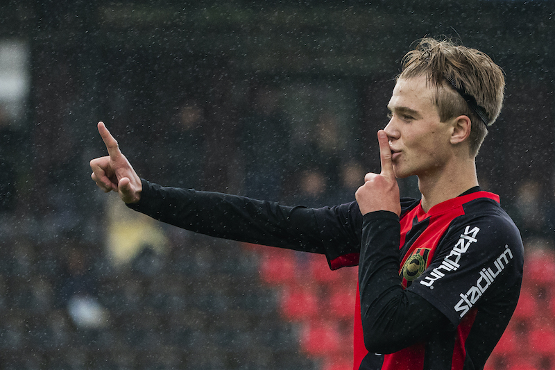 Foto: Jonathan Näckstrand / BILDBYRÅN / COP 94 / JN0004201024 Brommapojkarnas Wilmer Odefalk jublar efter 4-1 av Dennis Ali Brännström under fotbollsmatchen i U16 SM-finalen mellan Brommapojkarna och Häcken den 24 oktober 2020 i Stockholm.