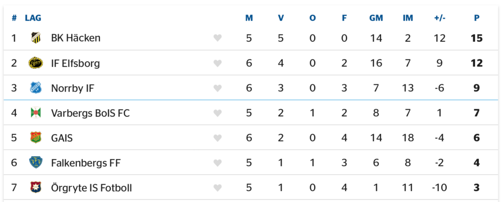 Två Boråslag jagar närmast bakom BK Häcken. IF Elfsborg lirade sex tidiga matcher och har haft spelledigt sedan starten på juni. Jack Cooper Love och Noah Söderberg har stått för de flesta av Elfsborgs mål. Norrby inledde med dubbla förluster, men har plockat nio pinnar på de följande fyra bataljerna.