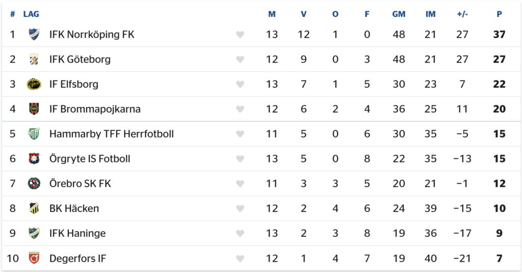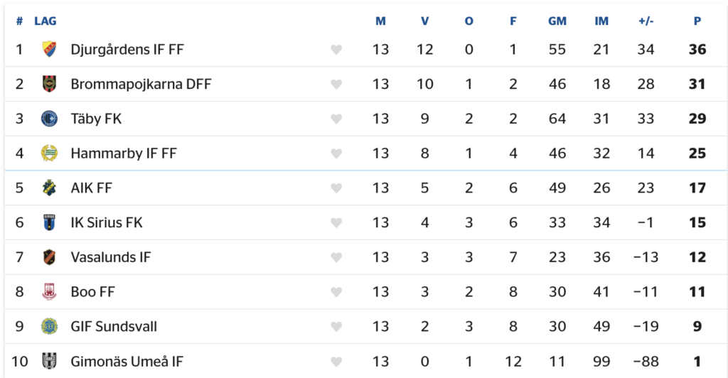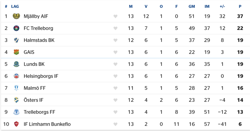 Samma facit har också Mjällby AIF i den södra serien, med en distans på hela 15 poäng ner till tabelltvåan FC Trelleborg. Här är det dock jämnare runt slutspelsstrecket: samtliga lag på placeringarna 3-6 står på 19 poäng, samtidigt som sjuan Malmö FF också kan gå upp och förbi vid segrar under höstens hängmatcher. Ja, det är definitivt upplagt för dramatik.